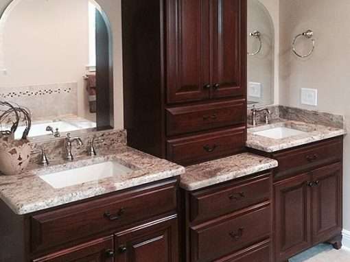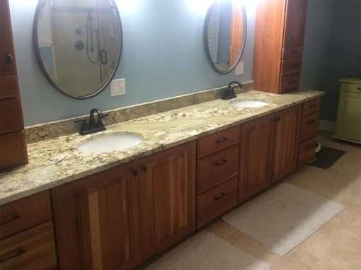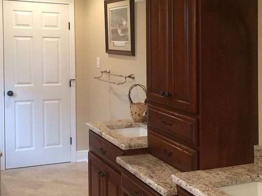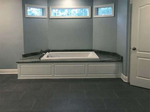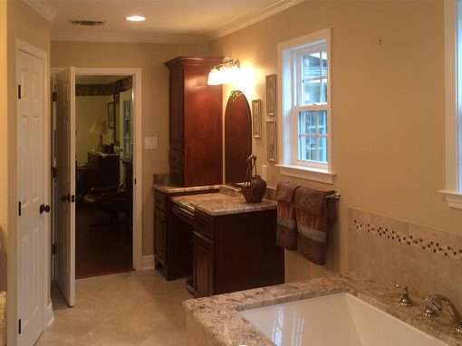 This luxury bathroom renovation required a full gutting to accomplish the design goals. It includes the Huckins Construction specialty of custom cabinetry and tiling along with a barrier free walk-in shower but also has radiant heat floors for comfort during chilly mornings. This homeowner also wanted a pricey custom granite cap around the tub enclosure.