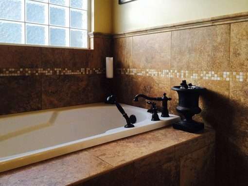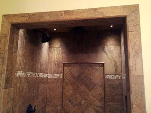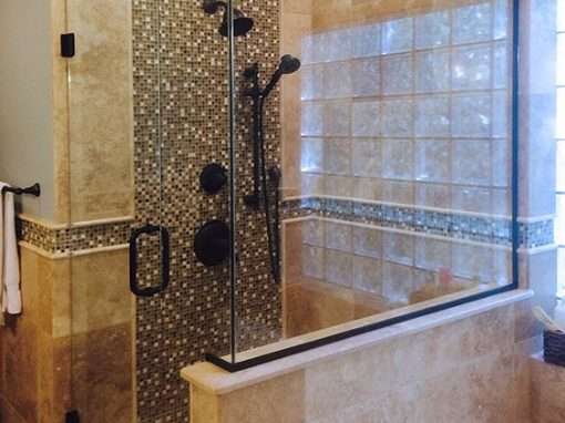 This fully custom Ocean Springs, MS master bathroom remodel makes creative use of travertine stone accented with mosaic tile. It features a frameless glass shower with multiple shower head options and mosaic tile backdrop. The mosaic accents are further enhanced with the use of glass block for aesthetics ans natural daylight.