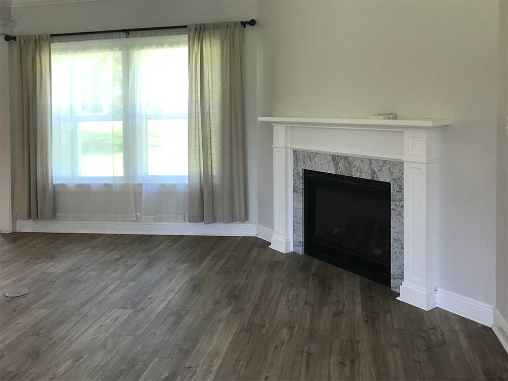 This custom kitchen renovation required full gutting out to create an improved layout for better form and function. The renovated kitchen design features LED lighting, undercounter and display uppers, new cabinetry and countertops, customized pantry space, and more. The spacious new island integrates a dining table and seating. This project also involved a custom fireplace designed and built by Huckins Construction.