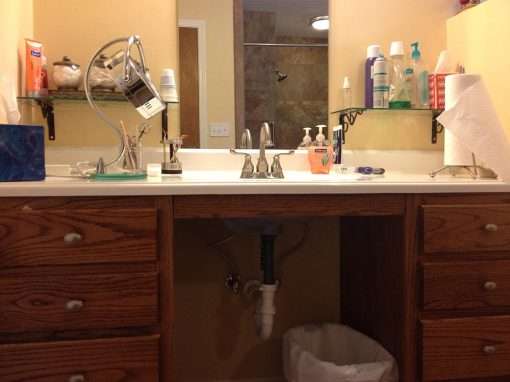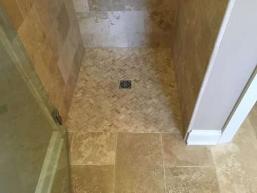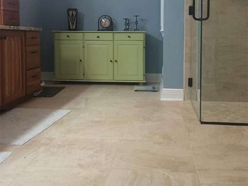 A young military couple wanted to update their existing bathroom to be modern and better suited to the neighborhood. Another goal was to make the home easier to sell if new orders from the Air Force required them to move to a new area. This design includes a custom, barrier-free shower, Tuscany ivory custom tile, upgraded tub skirting and tile surround, and more.