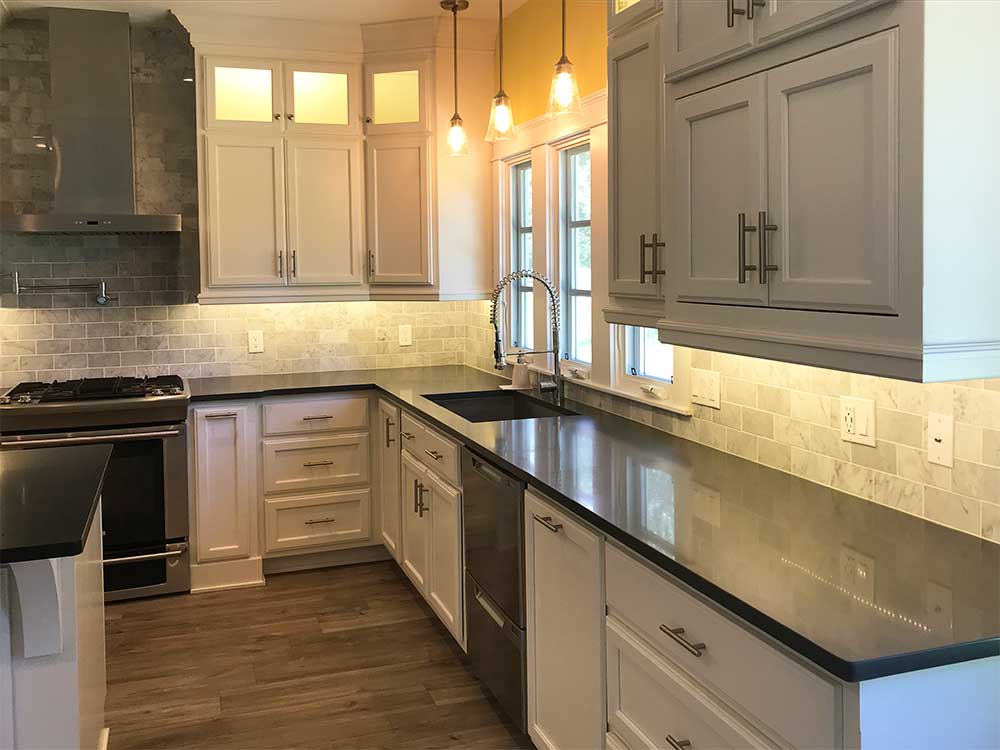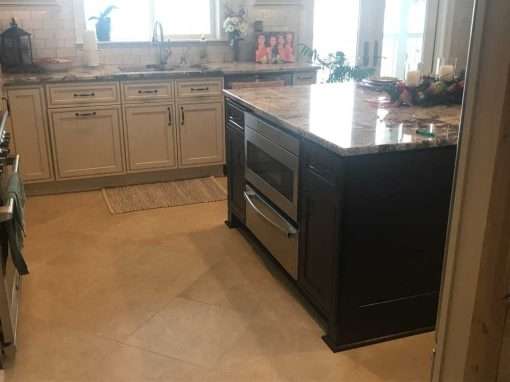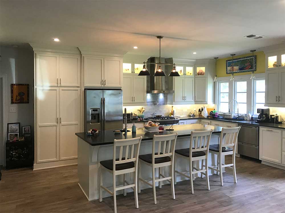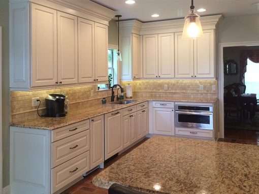 This Biloxi, MS kitchen upgrade was created for a special couple we had the privelage of working with a few years prior on a luxurious master bathroom remodel. Their existing kitchen was monochromatic and a brighter, enhanced design was desired. Upgrades to the cabinet design were integrated to better facilitate storage. New flooring was also installed throughout the house.