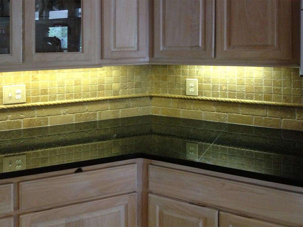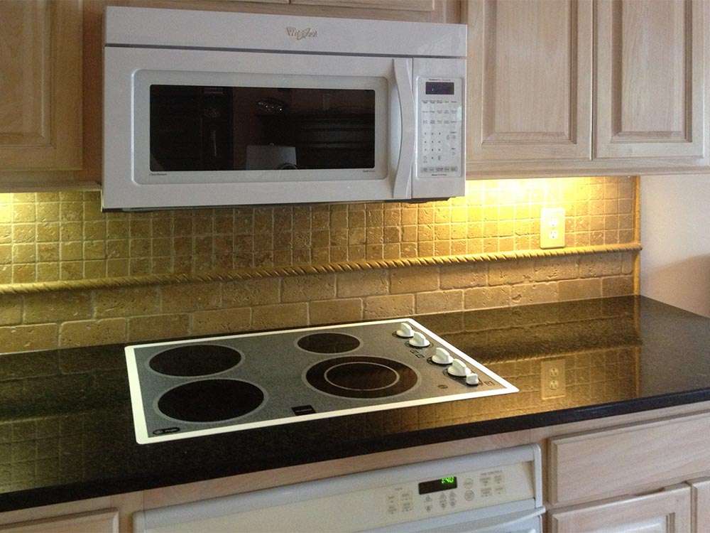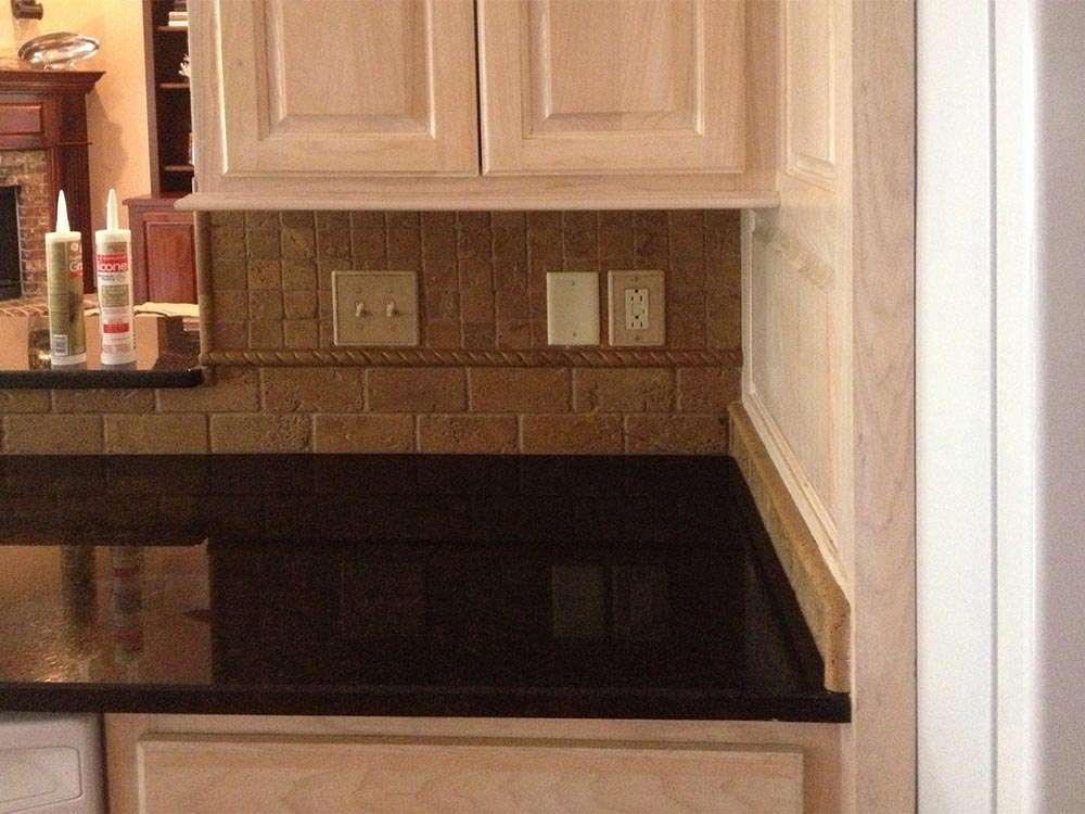This Gulfport, MS kitchen remodel features black granite countertops and tumbled noce travertine stone backsplash with luxury cabinetry, under cabinet lighting, and island with snack bar. Practicality is combined with style in this kitchen design.