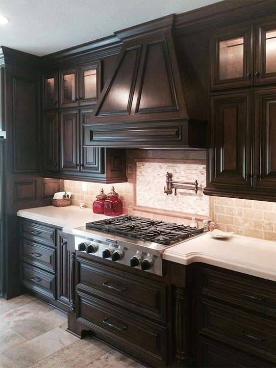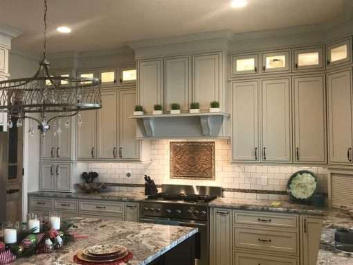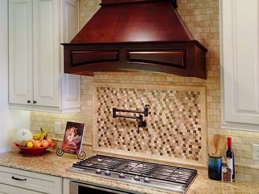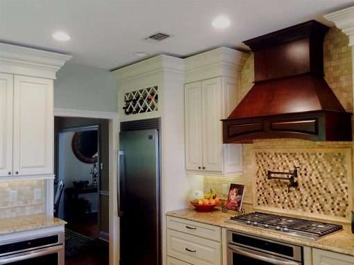 This spacious Ocean Springs, MS custom kitchen remodel features lots of granite countertop space and an abundance of cabinet space. Some of the design features include a custom travertine mosaic backsplash with pot filler behind the stove, a striking vent hood, large, oversize crown molding, and generous lighting.
