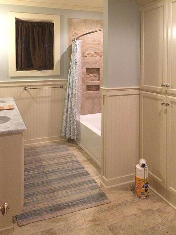 This family lake house still had the original and very dated bathroom design from its construction 50 years ago as you can see in the before pictures. The result of the custom bathroom remodel shows a stunning difference with an ideal blend of modernizing while maintaining the original charm of an older cottage. Since the same home also had a kitchen remodel, design features like the antique white custom cabinetry and color palette offer continuity in the room designs.