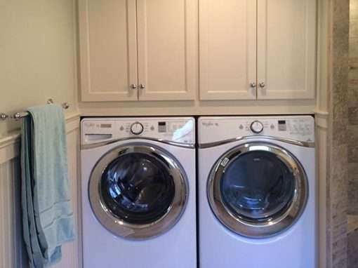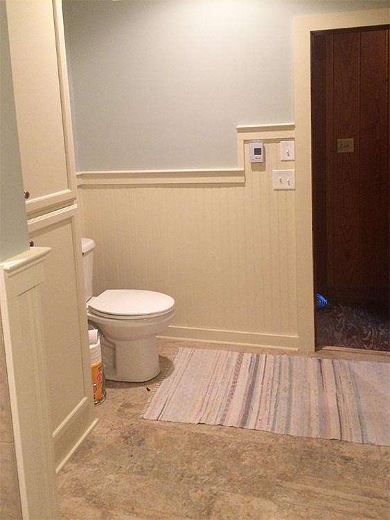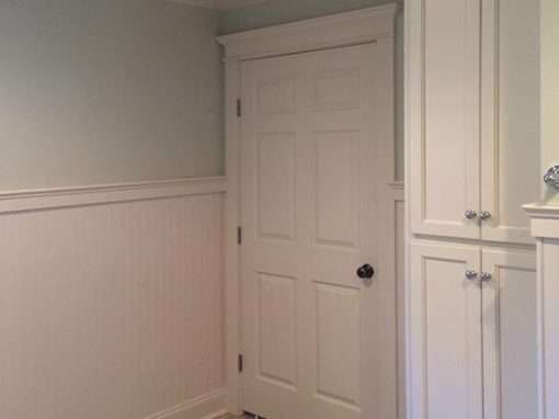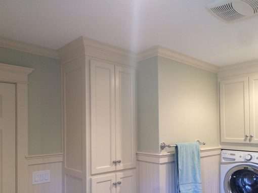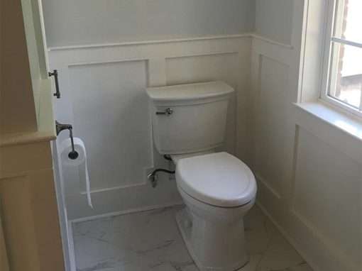 This master bathroom remodel preserves original features like the wainscoting while modernizing the color palette and adding lifestyle enhancements like the barrier free shower. Form meets function with integrated laundry facilities and ample bathroom cabinet space. Custom tiling for the shower and floor are both visually appealing and accessible so mobility issues don’t cause safety concerns.